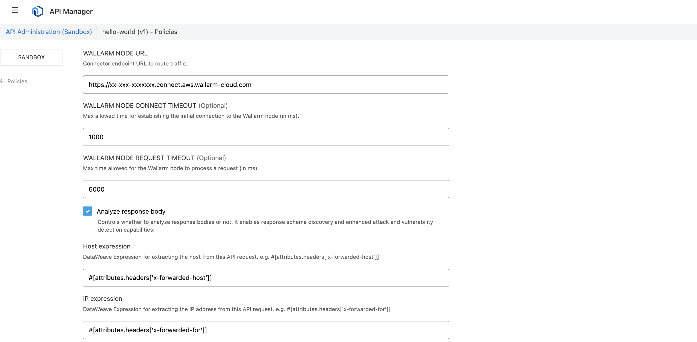Download the updated Wallarm policy and upload it to MuleSoft Exchange, as described in Step 2.