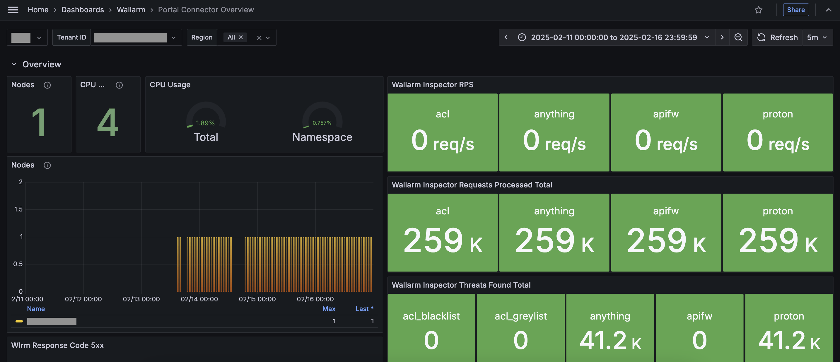From the Grafana home page, to reach the dashboard, navigate to Dashboards → Wallarm → Portal Connector Overview. For multiple Nodes, switch the Tenant ID corresponding to the connector endpoint to view each dashboard.