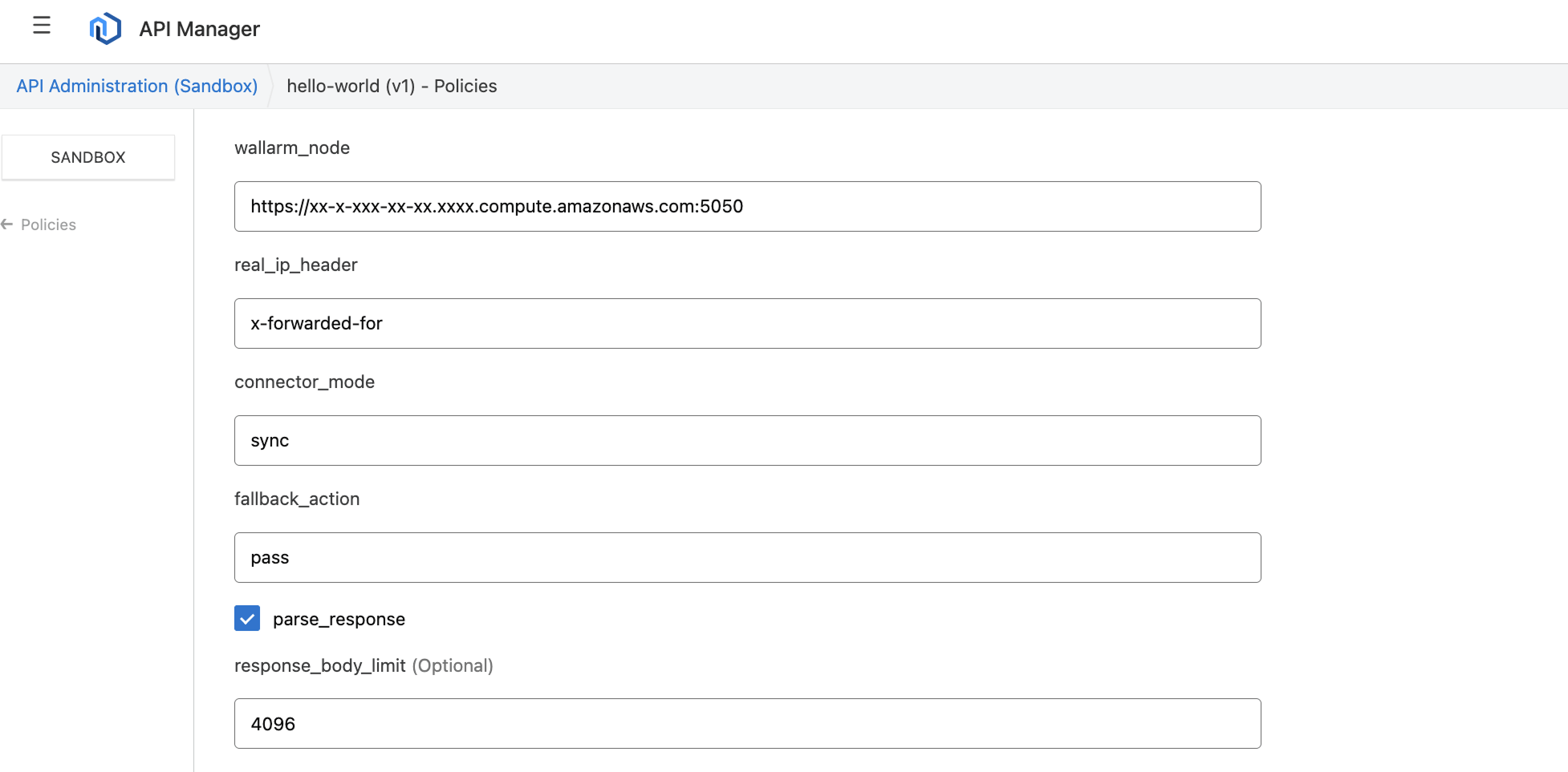 In the Wallarm policy settings for Flex Gateway, you can specify the following parameters: