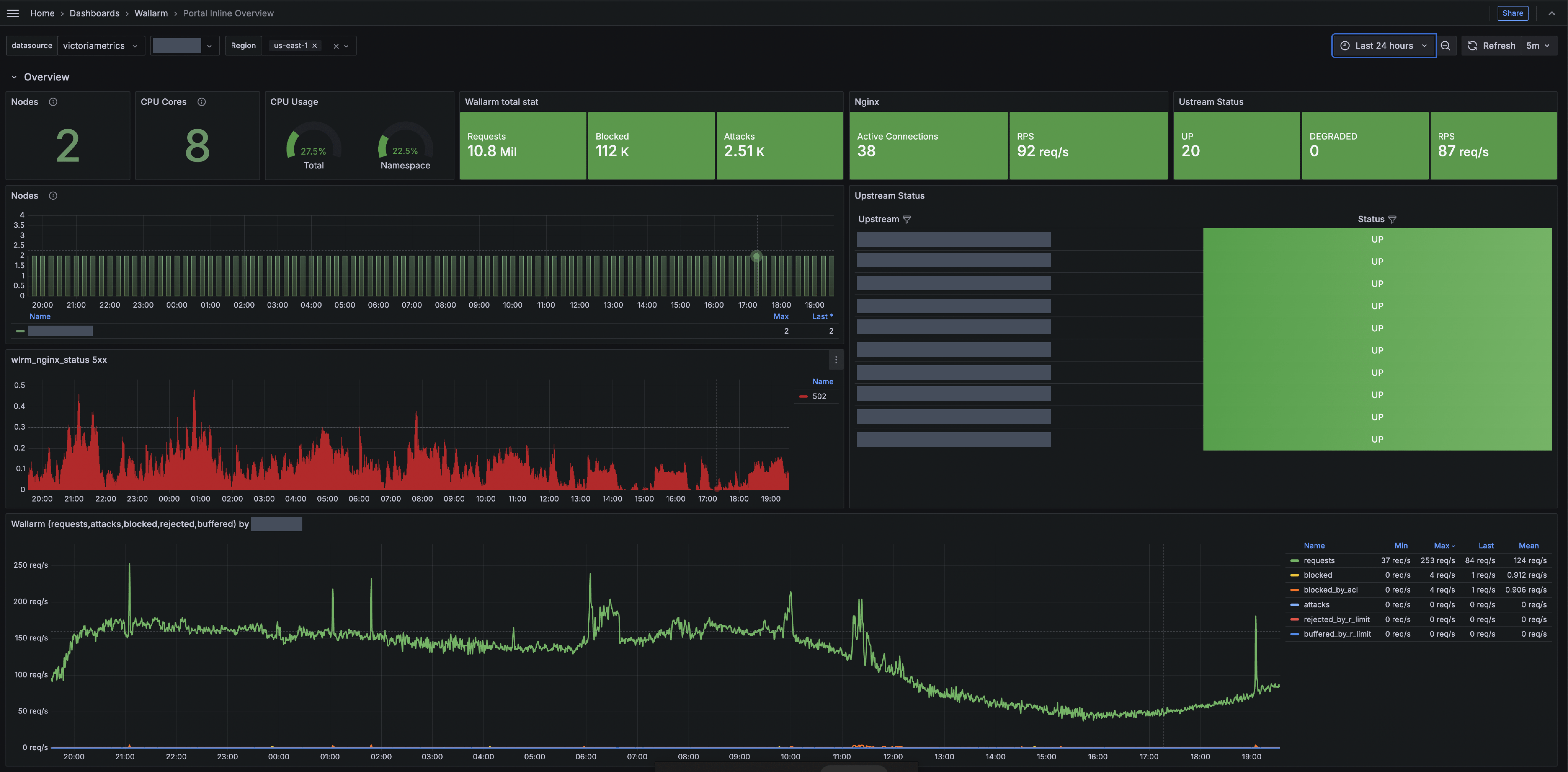 You can use this dashboard to view key metrics such as total processed requests, requests per second (RPS), detected and blocked attacks, number of deployed Edge Nodes, resource consumption, number of 5xx responses, etc.